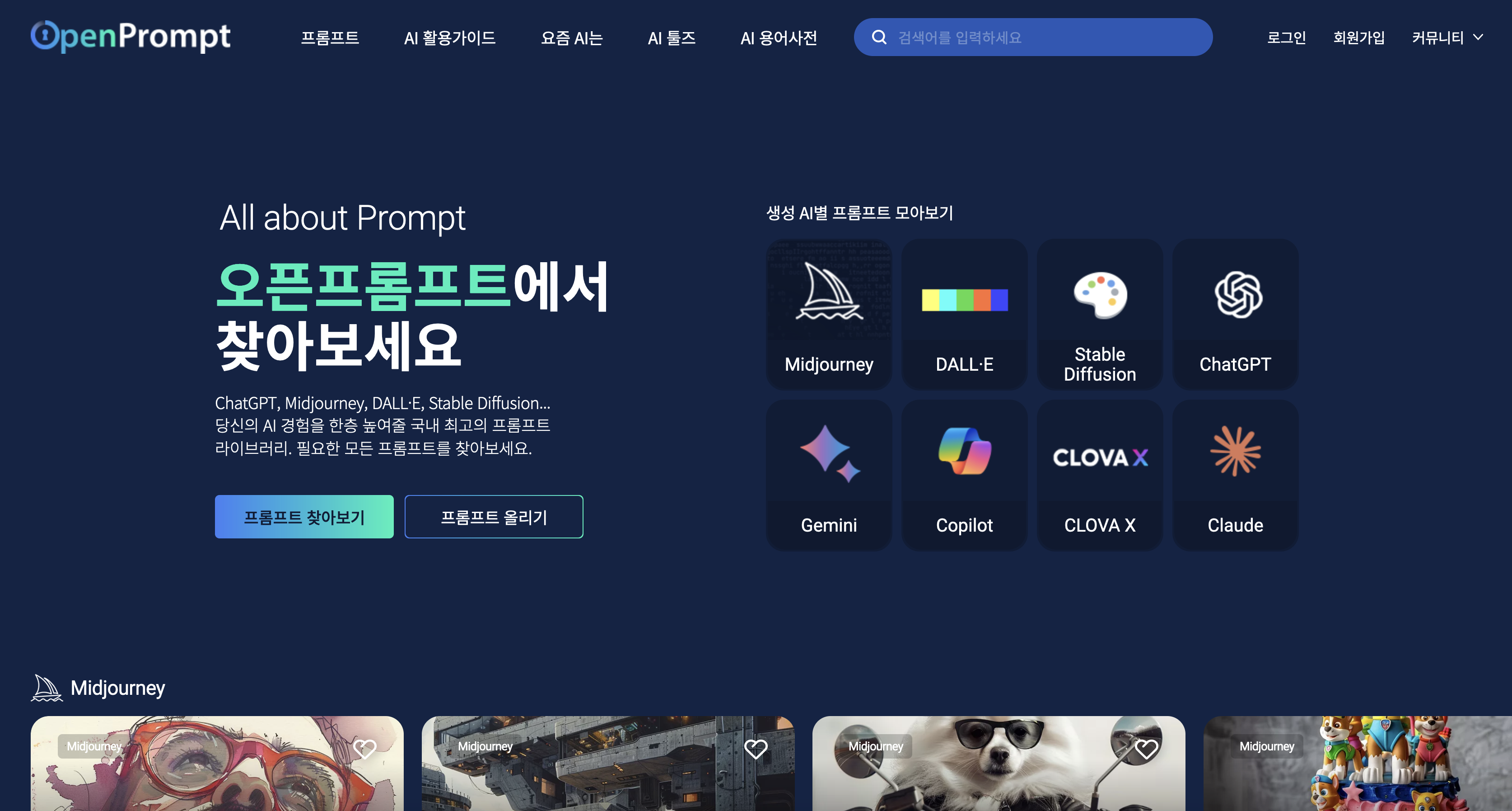 오픈 프롬프트는 모델별로 프롬프트를 볼 수 있으며, 각 사용자들이 올린 프롬프트를 확인할 수 있습니다.