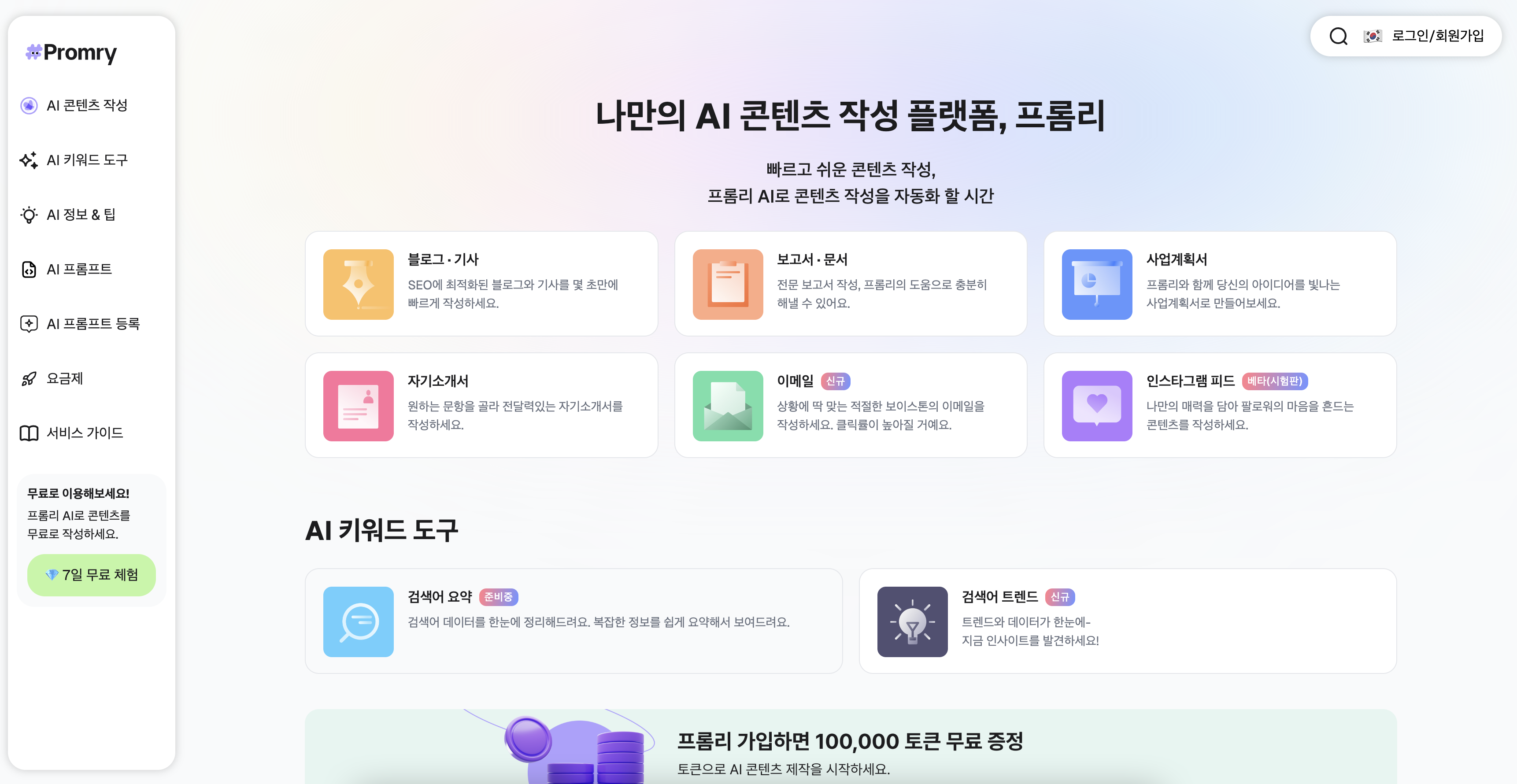 프롬리AI는 한국어에 특화된 AI 도구로, 단순히 블로그 글 작성을 넘어 다양한 유형의 콘텐츠 생성이 가능한 서비스입니다.